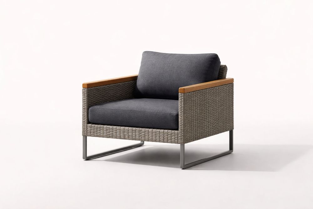 Fauteuil d'extérieur en osier et acier avec accoudoirs en bois massif et coussins en tissu gris foncé