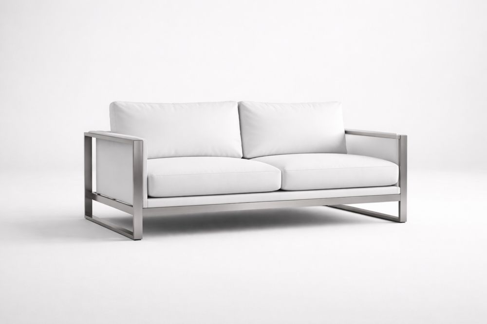 Ce canapé deux places est doté d'une structure en aluminium. Le revêtement est en tissu polyester blanc, facile à entretenir. Les coussins, garnis de mousse de polyuréthane, offrent un bon soutien. Dimensions : longueur 160 cm, largeur 90 cm, hauteur 75 cm. Poids : 40 kg.
