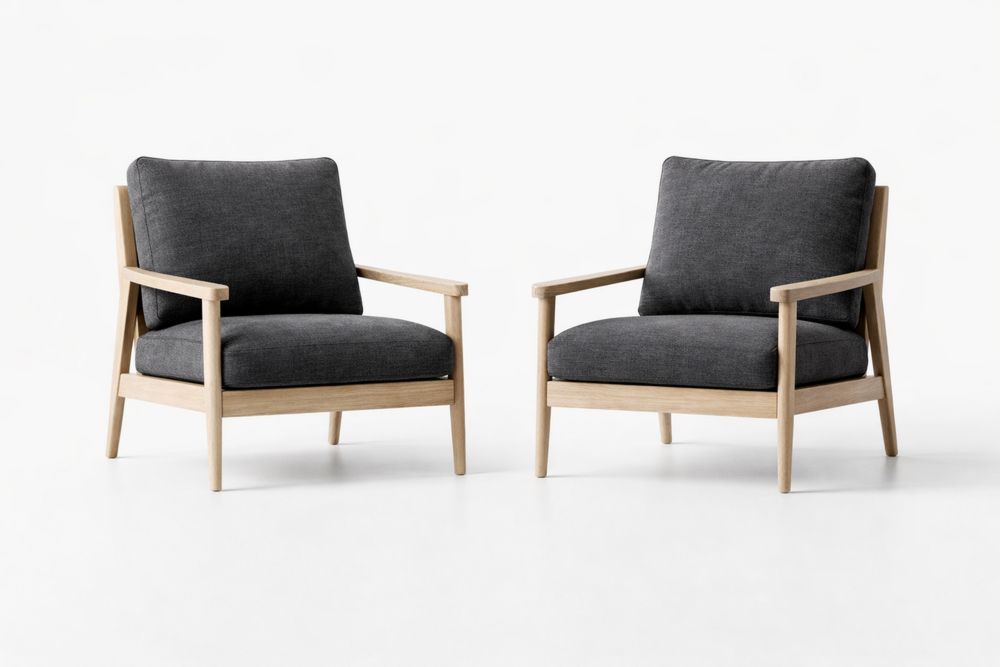 Ensemble de deux fauteuils avec structure en bois massif clair et revêtement en tissu polyester gris.