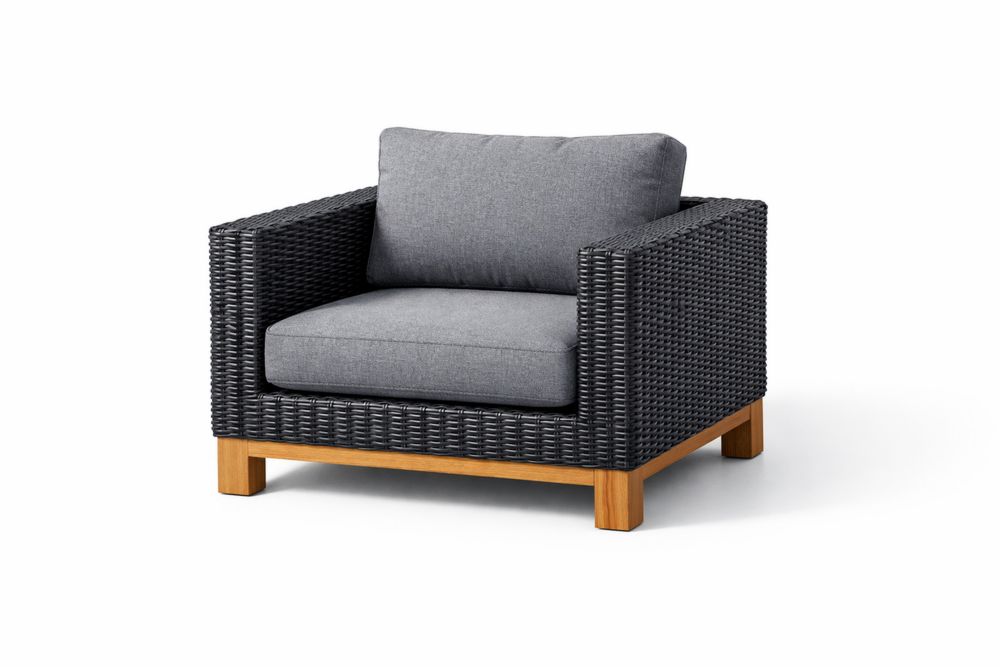 Fauteuil en résine tressée Noir avec coussins Gris et cadre en Teck