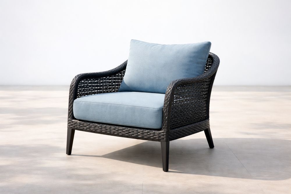 Fauteuil en résine tressée noir coussins bleu 75x80x70 cm