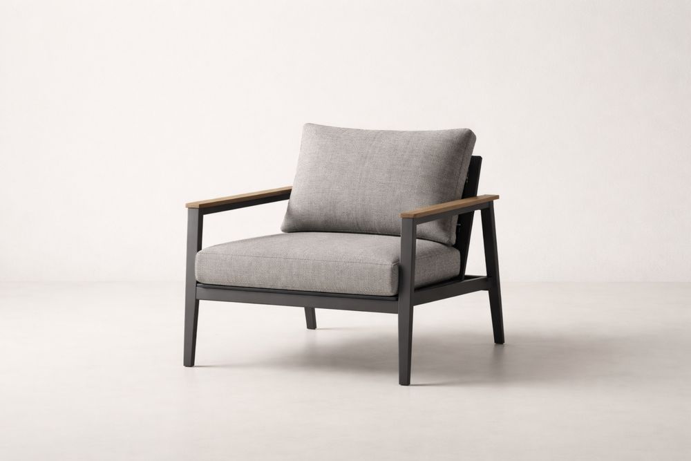 Fauteuil en tissu avec accoudoirs en bois massif et cadre en aluminium