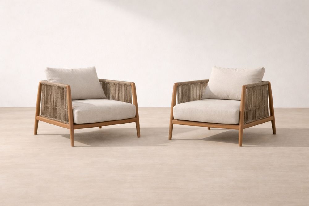 Paire de fauteuils en bois d'acacia et corde avec coussins polyester beige